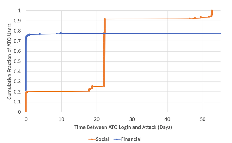 After a successful ATO, an attacker behaves much like a common purse thief who wants to make big purchases quickly in case the victim does notice the crime. Researchers found that 72 percent of the financial accounts made fraudulent transactions within an hour of their initial compromise.