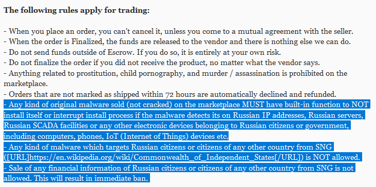 The market, which also sells malware and hacking tools with almost no rules or limits, requires a “built-in function” to make sure the malware cannot impact any computer in Russia including those belonging to government, industry or private citizens. Targeting Russians or citizens from the Russian Commonwealth with malware is specifically banned.