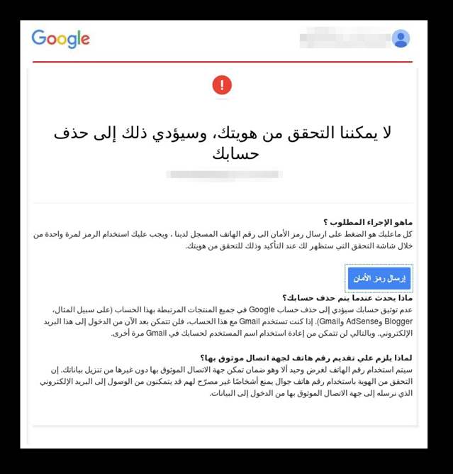 A fake Google alert written in Arabic says “We are not able to verify your identity, and this could result in the termination of your account.” (Amnesty International)