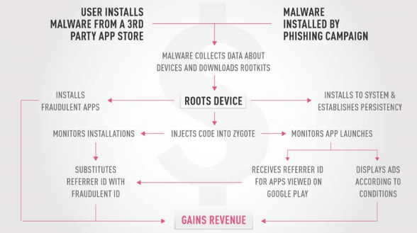 After infection, the malware roots the victim’s device to gain full control and remove defenses. CopyCat uses Zygote to fraudulently install apps and display ads so it can collect profits estimated by the researchers to reach about $1.5 million during the peak of activity during April and May 2016.