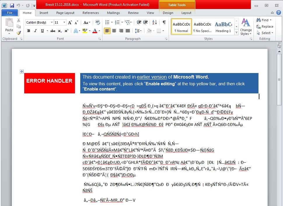Accenture said it observed activity relating to this malware campaign around the same time that government leaders in the U.K. announced a draft deal for Brexit earlier this month. The name of the Word document used in the campaign is “Brexit 15.11.2018.docx,” suggesting that the Russian hacking group is exploiting current events to make its messages seem legitimate. The document displays garbled text in an attempt to get targets to enable macros, unleashing the “Zekapab” malware.