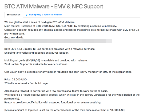 A detailed listing on an underground forum for the bitcoin ATM malware (Trend Micro)