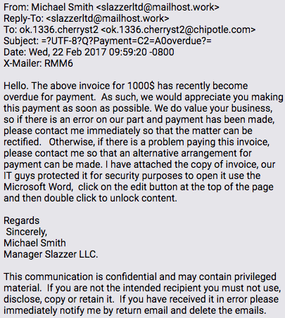 On Feb. 22, a phishing email carrying an attachment titled “Payment overdue.eml” was sent to an email account associated with a Chipotle location in Tulsa, Oklahoma. The body of the phishing email describes a nonexistent overdue payment and encourages the victim to open a booby-trapped attachment. The email sender is listed as Michael Smith, an imaginary manager for a nonexistent company named Slazzer LLC.