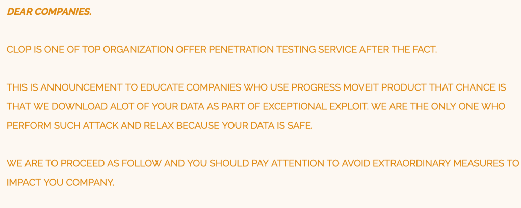 Hackers with the group exploited a previously undetected vulnerability in the MOVEit Transfer file transfer software, which the group said used to attack “hundreds of companies” as “part of exceptional exploit.” CL0P said this week it would give affected companies until June 14 to contact them and begin negotiating a price for their data. If a deal can’t be reached within three days, or the company does not get in touch, the group said it will publish the data.