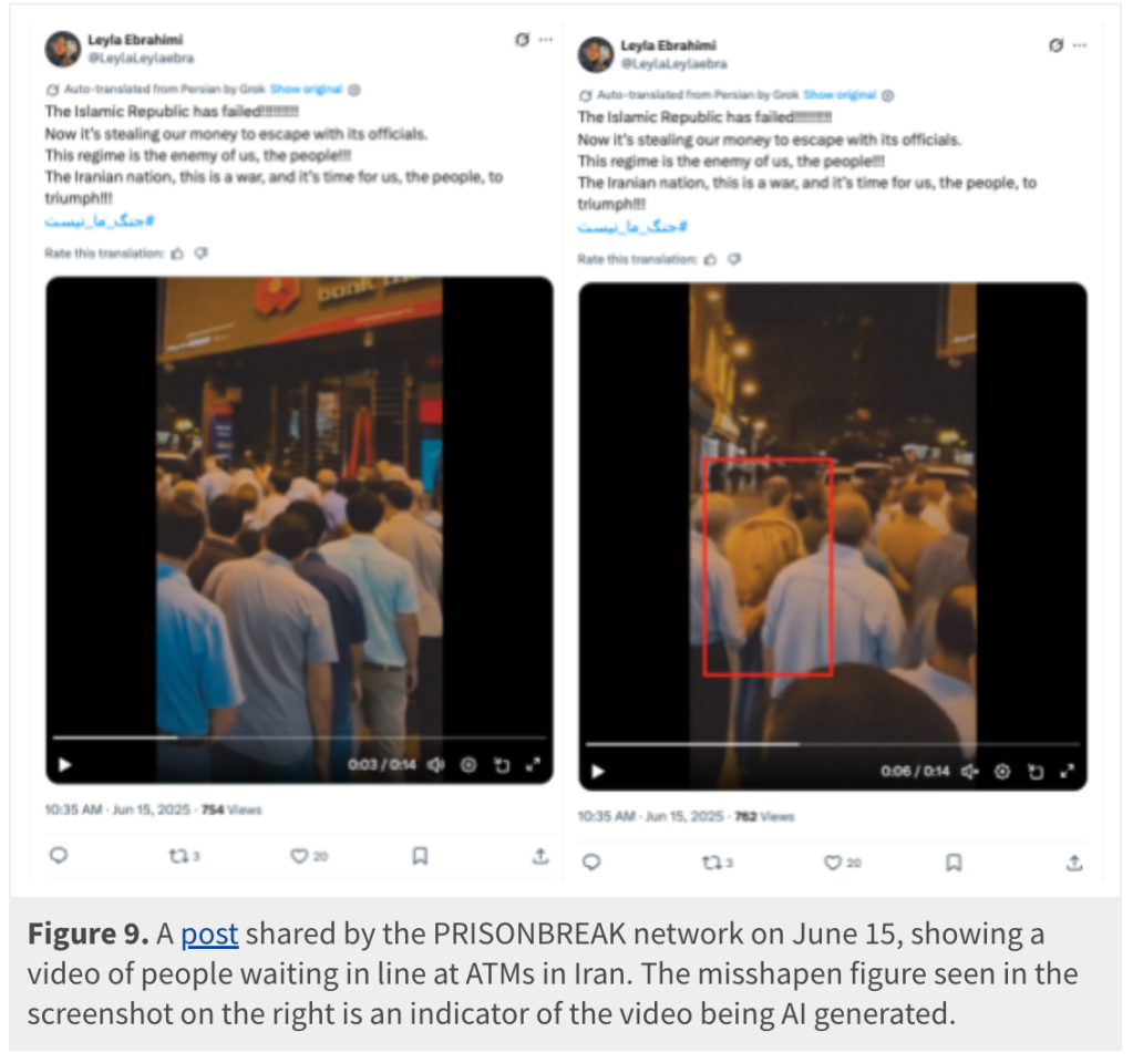 One widely circulated video, likely altered with AI, depicted people standing in line at an ATM before breaking into a riot, accompanied by messages like “The Islamic Republic has failed!” and “This regime is the enemy of us, the people!”