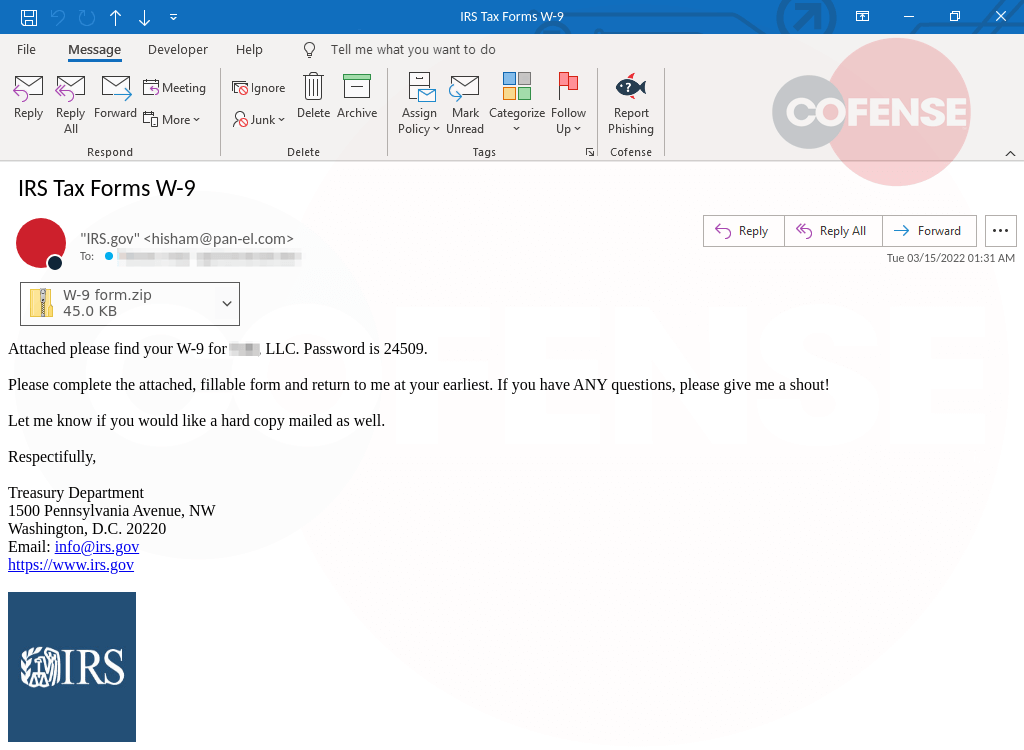 Cofense says the group’s malicious messages now include the IRS logo; make specific mention of the organization that employs the targeted people; and include a password that works to open a file archived attached to the email.