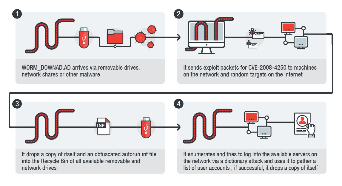 Conficker, also known as Downad, was first spotted in 2008 when it infected as many as 15 million machines. Experts saw it as one of the worst and most sophisticated cybersecurity crises to date.