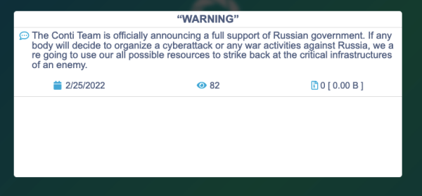After the initial post got some attention, the message posted to the site was modified to exclude the threat against critical infrastructure. It adds that Conti does “not ally with any government and we condemn the ongoing war,” saying that the threat to use its “full capacity to deliver retaliatory measures” remains as a response to “Western warmongering and the American threats to use cyber warfare against the citizens of Russian Federation.”