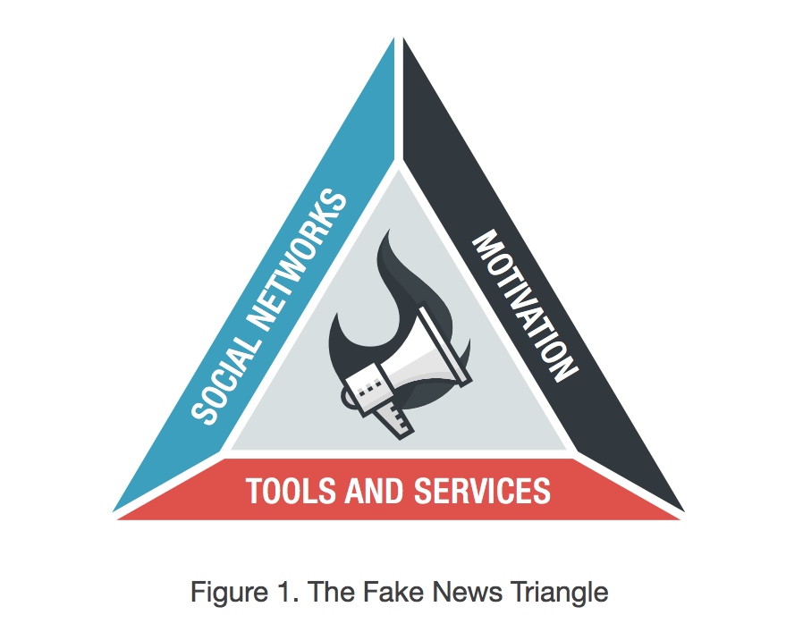 They identify three elements of what they call the “fake news triangle” — a combination of motivation; effective platforms in the form of social media networks; and promotional tools and services such as the ones they catalogue.