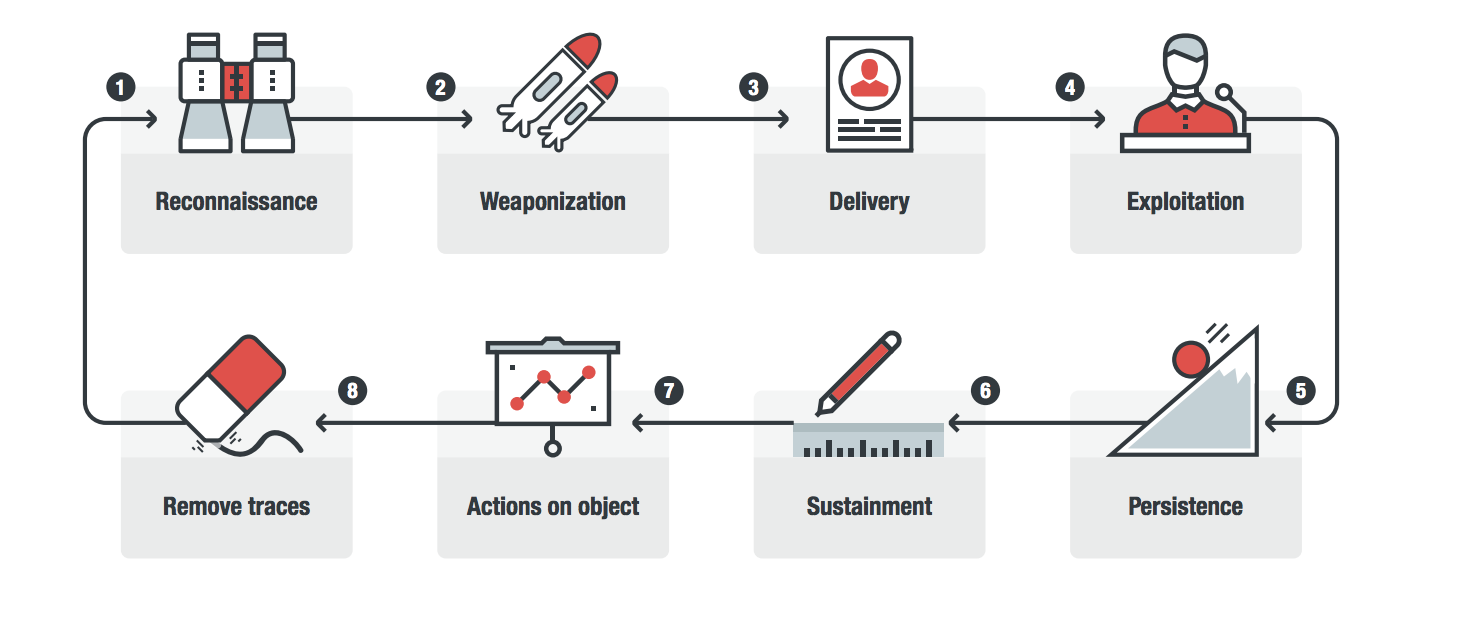 The authors identify a multi-stage process, modeled after Lockheed Martin’s famous cyber “kill chain,” that breaks down the purveyors’ activity loop into eight distinct phases.