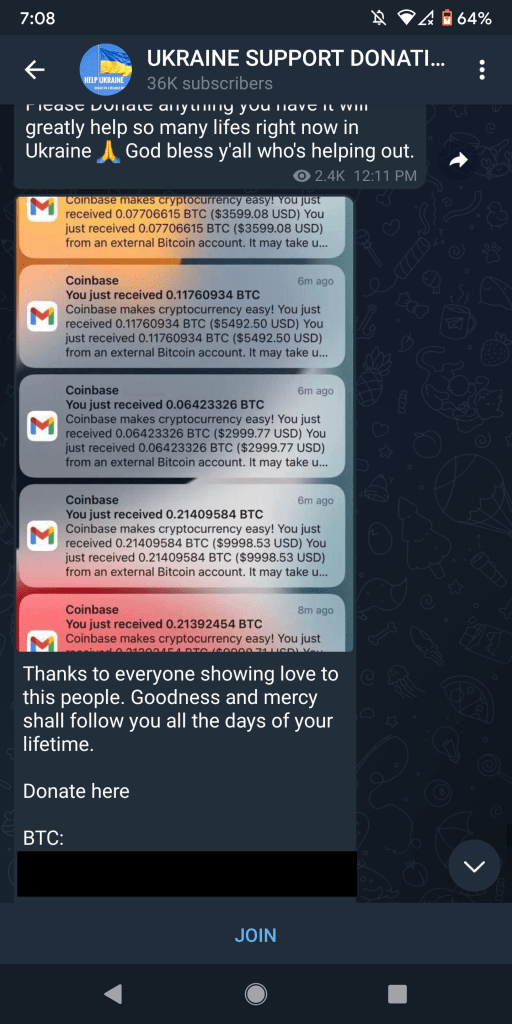 One of the channels Allen observed, “Ukraine Support Donation,” tried to show its legitimacy by posting screenshots of emails from Coinbase noting new donations. (A CyberScoop review of the wallet addresses provided showed no transactions.) In another channel, a user posed as trading platform Binance collecting donations with the account “Binance Support.” Clicking on the account shows its actually registered as “Binancesuport” and is not the real company.
