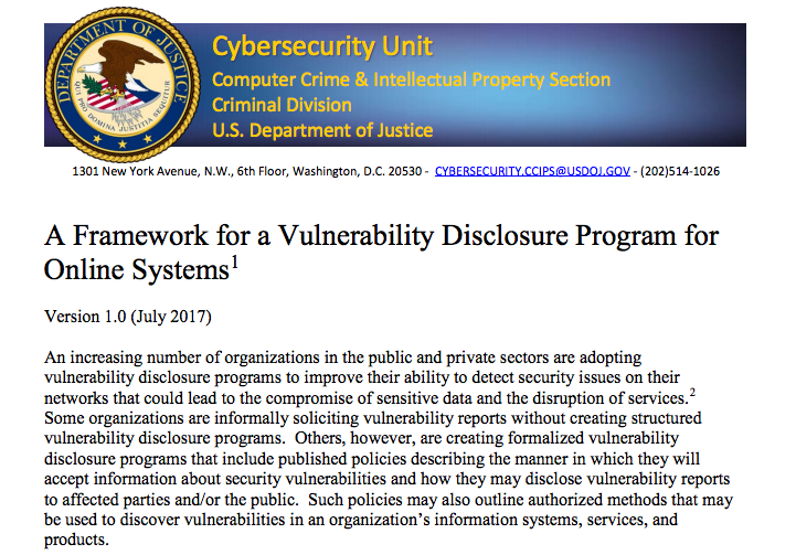 “Some organizations are informally soliciting vulnerability reports without creating structured vulnerability disclosure programs … The Criminal Division’s Cybersecurity Unit has prepared this framework to assist organizations interested in instituting a formal vulnerability disclosure program,” the guidance reads. “[Our] framework outlines a process for designing a vulnerability disclosure program that will clearly describe authorized vulnerability disclosure and discovery conduct, thereby substantially reducing the likelihood that such described activities will result in a civil or criminal violation of law under the Computer Fraud and Abuse Act.”