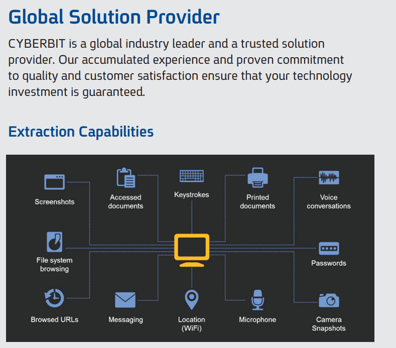 Launched in 2015 by Elbit Systems, one of Cyberbit’s premiere offerings is the PSS Surveillance System. The product is described by Cyberbit as “a comprehensive solution for monitoring and extracting information from remote PCs.” It boasts “covert operation” so it remains undetected.