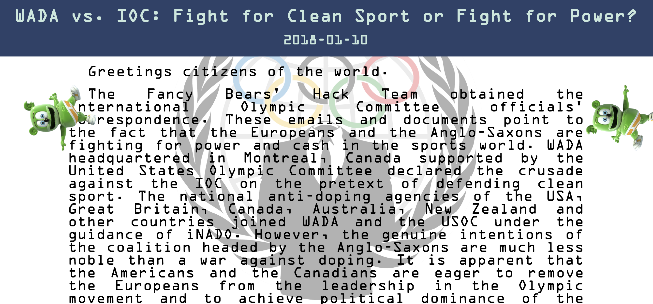 The group, known as “Fancy Bear,” posted conspiracy theory-laced, Illuminati-themed, heavily doctored pictures of Olympic officials Wednesday with text teasing a new release. A few hours later, the group posted a link to a website and leaked email archives with the title “#WADA vs. #IOC: Fight for Clean Sport or Fight for Power?”