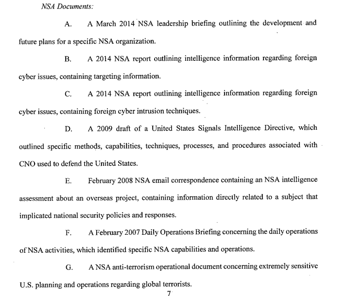The indictment lists numerous sensitive documents that were allegedly stolen by Martin and found at his residency, including intelligence agency manuals, briefings and other reports. FBI investigators confiscated material from Martin’s home that showed what the U.S. intelligence community knew about the hacking capabilities of foreign powers.