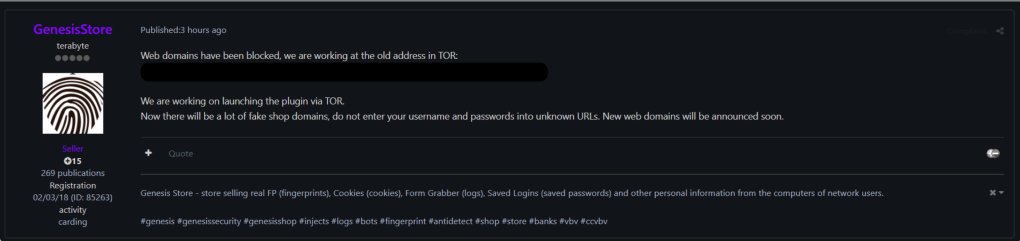 At least two of the domains and login pages for Genesis Market remain active, including both the site on the open internet and the dark web version. Someone claiming to be affiliated with Genesis posted to another forum Wednesday that the site was working at its old address via the Tor browser. “Now there will be a lot of fake shop domains, do not enter your username and passwords into unknown URLs,” the user by the name of “terabyte” wrote, according to a screenshot shared with CyberScoop by Austin Martin, an independent researcher based in Pittsburgh. “New web domains will be announced soon.”