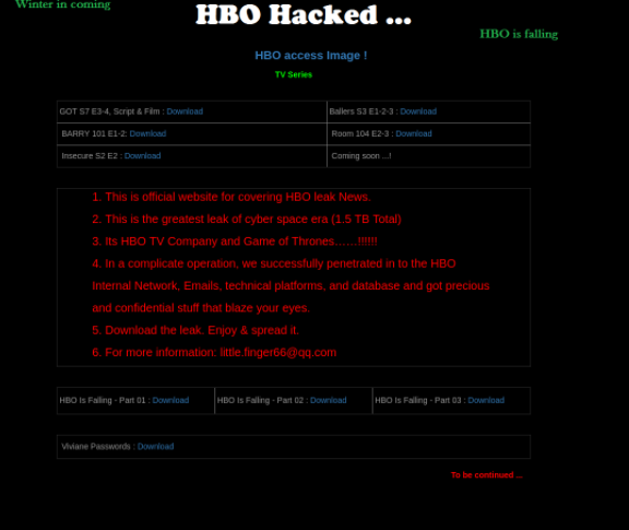 The hackers posted leaked data to “winter-leaks.com” on Tuesday, but by Wednesday had been taken offline. The HBO hack haul is 1.5 terabytes, the hackers say, seven times the 200 gigabytes of the Sony hack. There is no independent confirmation for these numbers, yet multiple files posted for download were above 100 GB in size.