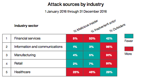 The finance industry, which can hold similarly valuable mountains of personal data, was both the most-attacked industry of 2016 according to IBM as well as the only other major industry that saw a majority of threats coming from inside the organization. In finance, however, the lion’s share of the insider threat is inadvertent.