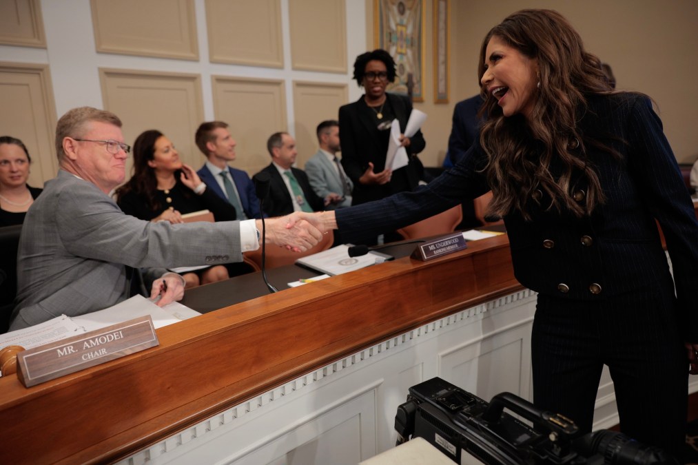 Homeland Security Secretary Kristi Noem (R) greets House Appropriations' Homeland Security Subcommittee Chairman Mark Amodei, R-Nev., before a hearing in the Rayburn House Office Building on Capitol Hill on May 6. (Photo by Chip Somodevilla/Getty Images)