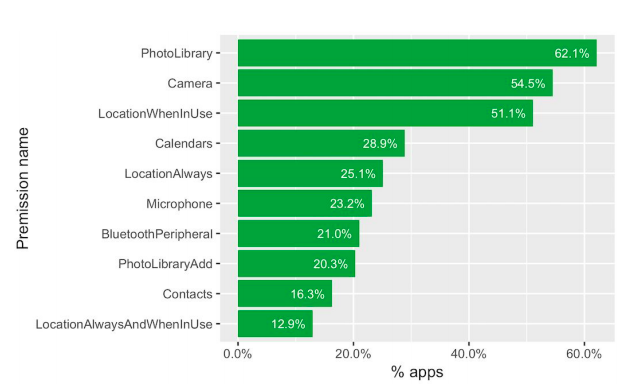 An analysis of 30,000 iOS applications released Wednesday by Wandera shows that social networking, weather, and e-commerce apps request access to lots of valuable information about users. Sixty-two percent of the iOS apps examined sought permission to a user’s photo library, while 55 percent requested camera access and 51 percent wanted to know a mobile user’s location.