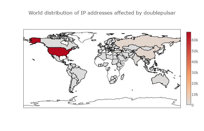 U.S. computers are by far the most frequently hit targets of DOUBLEPULSAR, a backdoor implant allowing attackers to stealthily collect information and run malicious code on a target’s machine, according to the Swiss security firm Binary Edge, which counted 183,107 infected machines as of early Monday morning. More than 67,000 of those machines were American, while China, Russia and the U.K. have suffered several thousand infections each. On Friday, that number was 100,000 globally. An average of 25,000 machines have been infected globally every day over the last week.