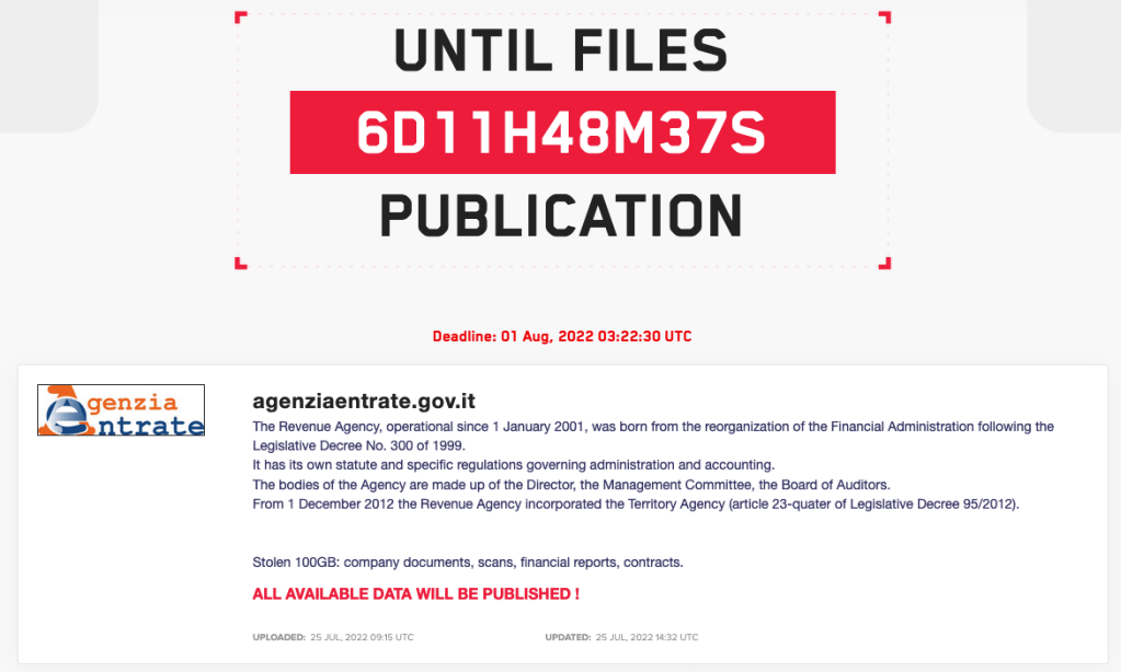 Ransomware group targets Italian tax agency