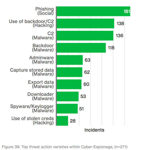 Techniques/methods used by cyber espionage groups — graph and data via verizon