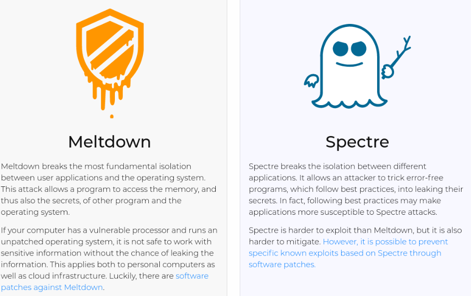 The bug is called Meltdown because it melts security boundaries normally enforced by hardware. Spectre derives its name from speculative execution, the process by which a computer system performs a task that may not be actually needed.