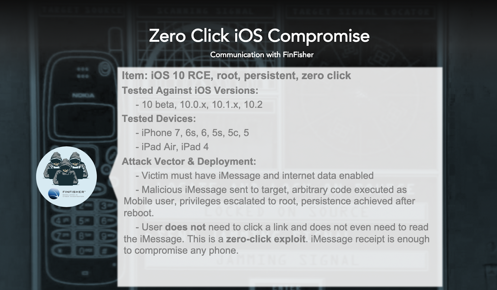 FinFisher, known for its FinSpy exploits, offered to sell the nation-state a zero-click iOS compromise that will give an attacker root access to a device. The exploit would work in iOS versions up to 10.2, the latest version of the operating system at the time in which Blaich and Flossman conducted their research.
