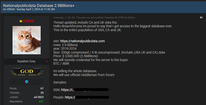 The data breach at National Public Data compromised 2.9 billion records, including full names, addresses, birth dates, phone numbers, and Social Security numbers. The stolen data spans at least three decades and was being sold on the cybercrime underground with server credentials for $3.5 million.