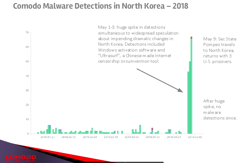 “Comodo has security software (and thus malware detections) inside North Korea,” said Kenneth Geers, chief scientist at Comodo.