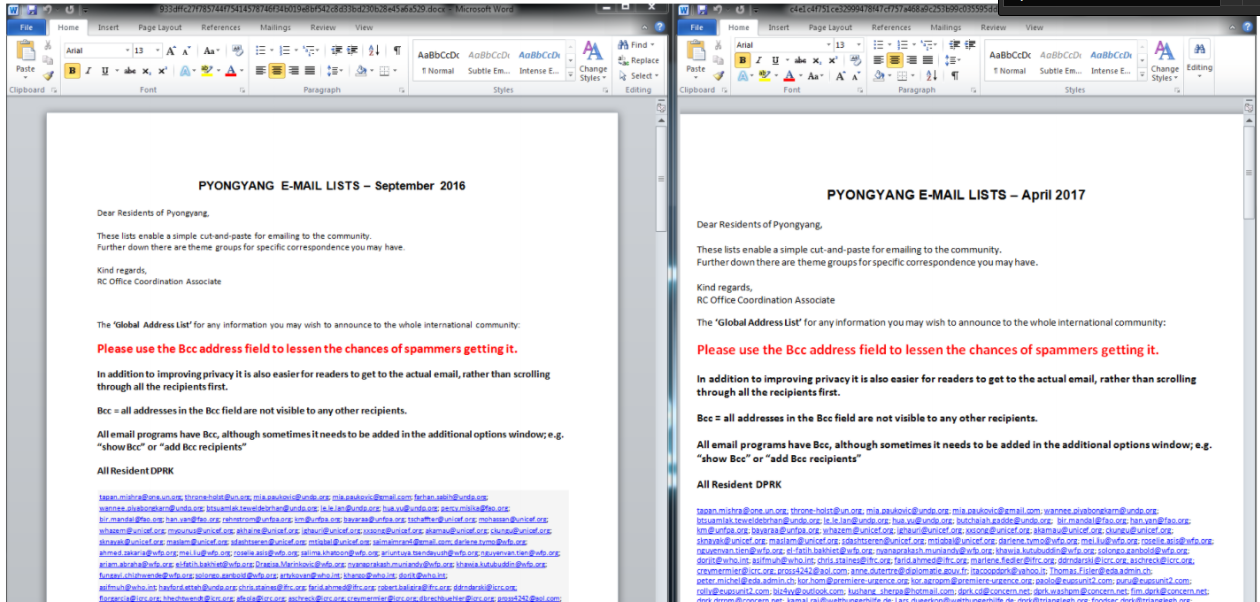 Both include phone numbers, email addresses and contact information for people from institutions including the United Nations, UNICEF, and North Korean embassies.
