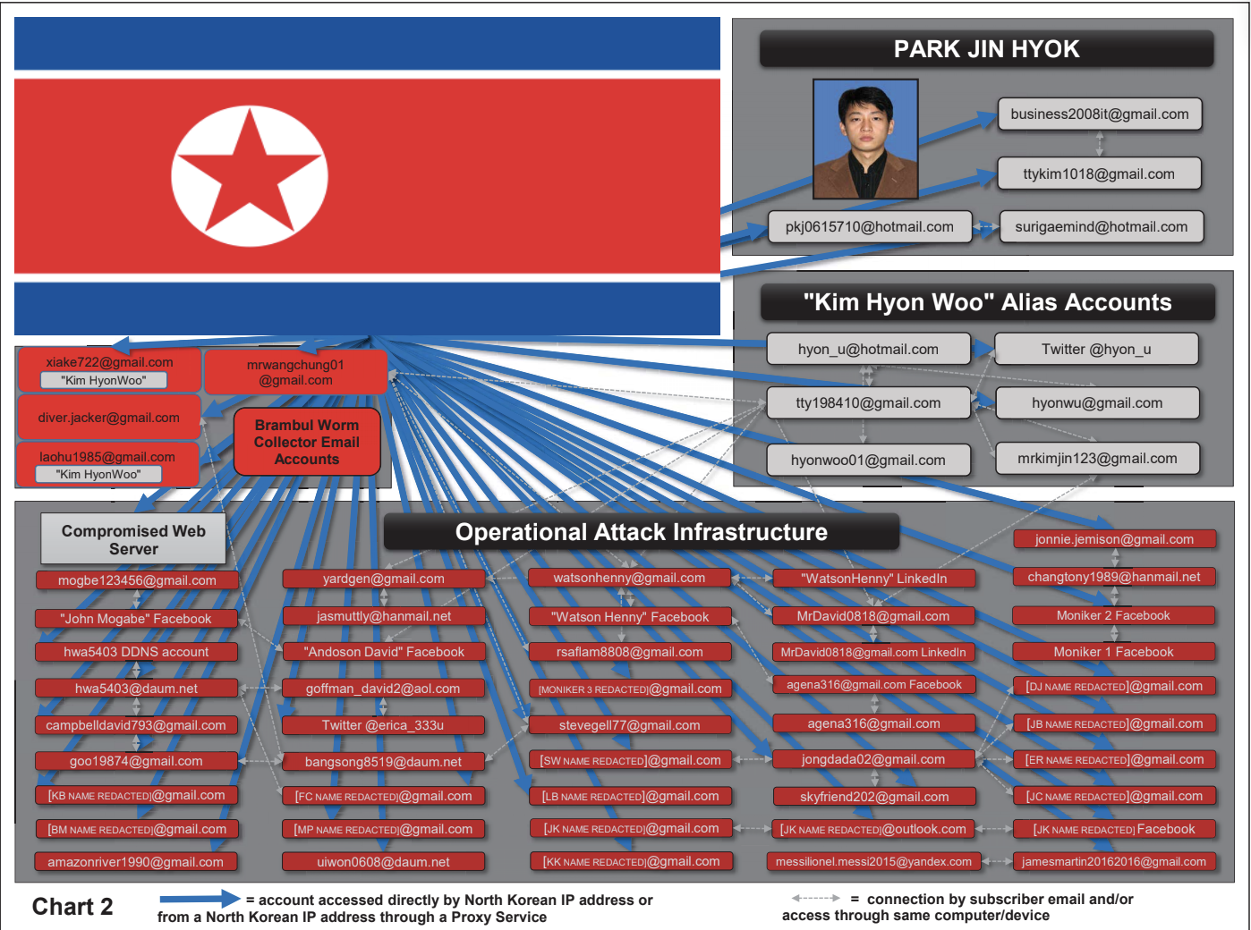 The complaint details how Park used a number of email addresses to conduct spearphishing campaigns on various targets. Officials said Park’s reuse of a number of email addresses was used to establish his identity.