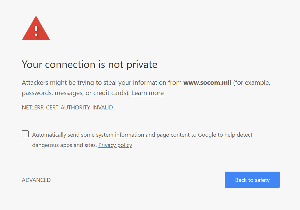 A message displayed by the Google Chrome browser when trying to visit the website for U.S. Special Operations Command.