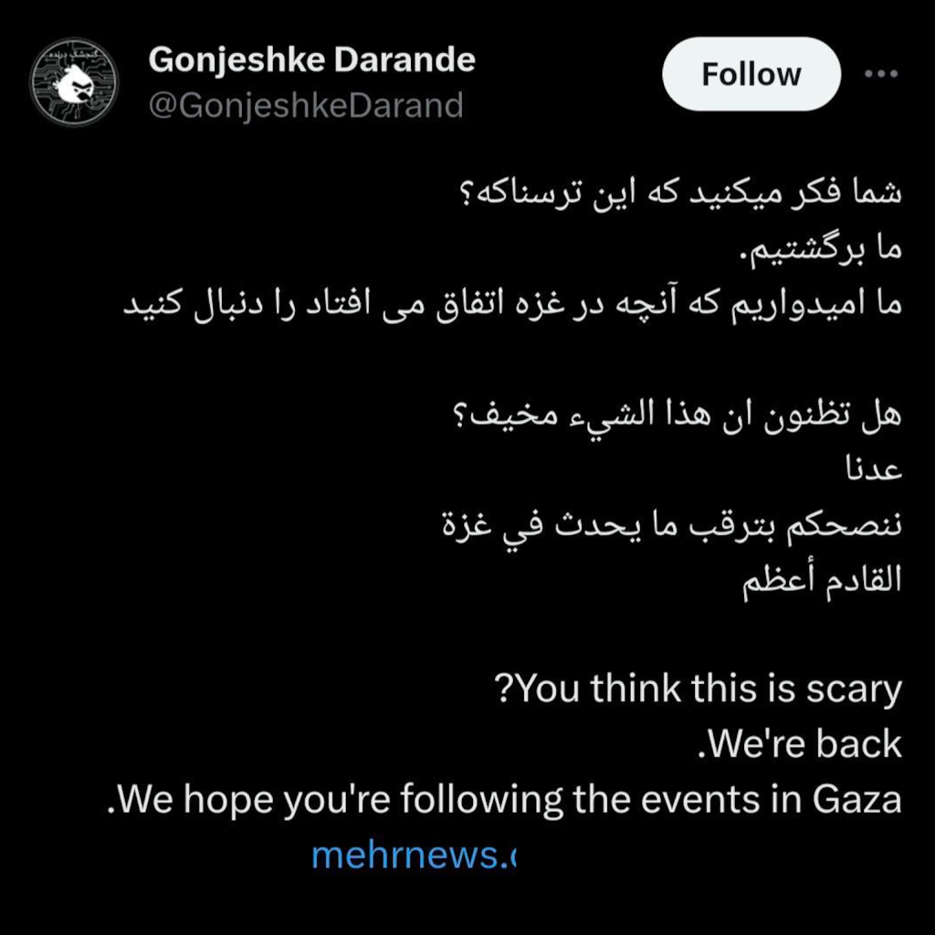On Monday, Gonjeshke Darande — “Predatory Sparrow” in Persian — posted the first message to its Telegram channel since January, along with a similar post on X, formerly Twitter. “Do you think this is scary?” the group wrote in Persian, according to a Google Translation. “We returned. We hope you’re following what is happening in Gaza.”