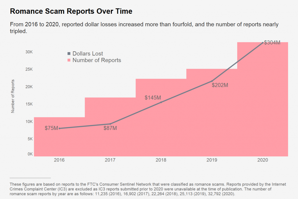 The trend line for the numbers isn’t good: Reports of romance scams have tripled since 2016, the agency says, to more than 30,000 in 2020. Over that span, the total dollar value of those reports have quadrupled, from about $75 million in 2016 to the $304 million cited this year.