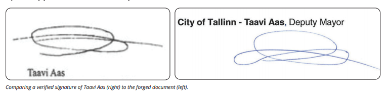 A Recorded Future analysis determined that Russian attackers used a forged signature (left) to impersonate Taavi Aas.