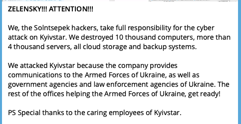 In a message directed to Ukrainian President Volodymyr Zelensky, the persona claimed to have inflicted widespread damage on Kyivstar and said the attack was the result of the company’s work supporting the Ukrainian military and law enforcement agencies.
