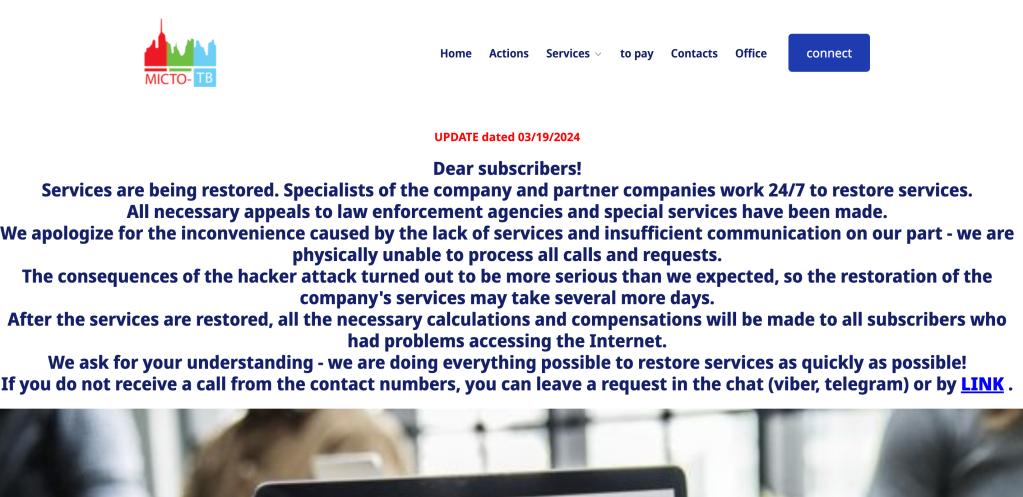 A message posted to the homepage of Misto TV on Tuesday said that services were being restored and that “the consequences of the hacker attack turned out to be more serious than we expected,” according to a machine translation of the message.