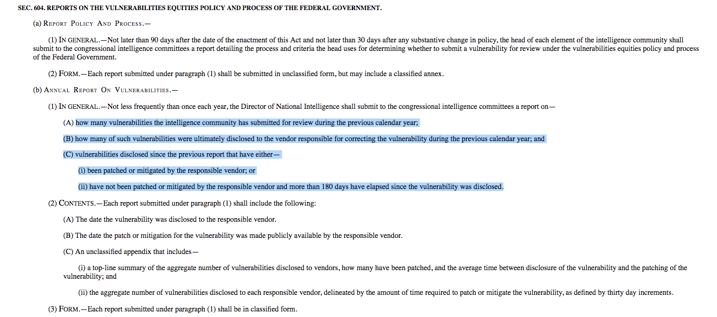 Section 604 of the Authorization Act requires the heads of the intelligence community to submit the congressional intelligence committees with an annual report detailing the VEP process and specific criteria employed by each agency. Based on how the requirements are currently written, the classified reports would contain highly sensitive material that must include not just a thorough explanation of the procedure itself but also the specific vulnerabilities entered into the process, companies affected, dates when disclosures occurred, a listing of the vulnerabilities eventually patched by the private sector and which software flaws were communicated but not fixed.