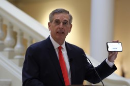 Georgia Secretary of State Brad Raffensperger holds up a mobile device during a news conference at the State Capitol on October 23, 2024 in Atlanta, Georgia. Raffensperger held a news conference to provide an update on early voting in Georgia. (Photo by Alex Wong/Getty Images)
