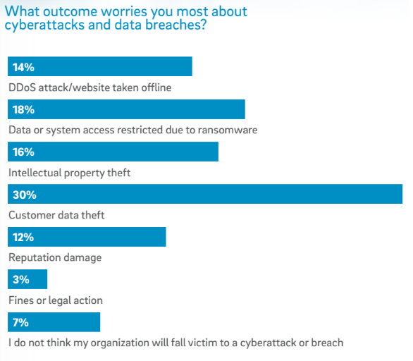 Customer data theft and ransomware, which exploded in prevalence over the last year, come in as the two most feared outcomes of cyberattacks, both of which are intimately connected to reputational harm. Some 7 percent of respondents say their organization won’t fall victim to a breach.