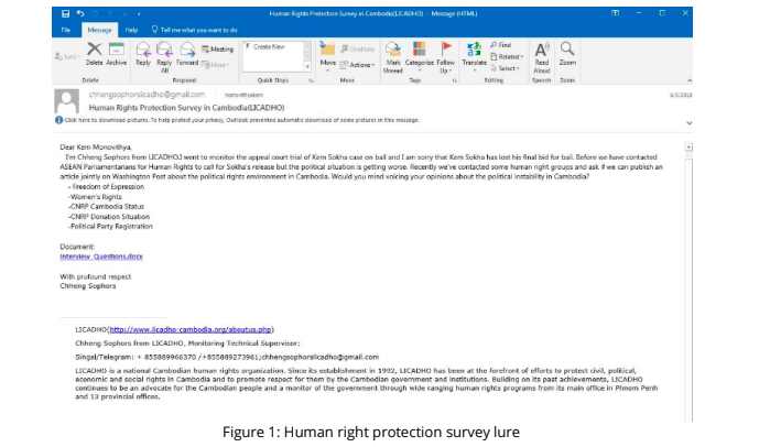 According to FireEye, the impacted Cambodian organizations include: the National Election Commission, members of parliament representing the National Rescue Party (CNRP), a Cambodian political party; high-profile Cambodians who’ve publicly advocated for human rights; and at least two unnamed Cambodian media entities.