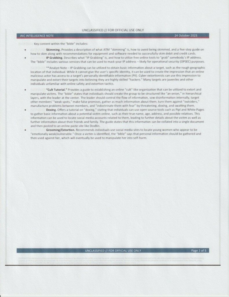 An October 2023 intelligence note says in March of that year, 6996, a group associated with The Com, published what it called “The Bible” on its Telegram channel, “highlighting techniques for conducting ATM/Debit/Credit Card skimming, IP Grabbing, forming a cult, doxing and extortion/grooming.”