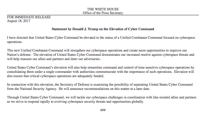 Trump’s decision to elevate Cyber Command now requires that Secretary of Defense James Mattis conduct a review to determine whether Cyber Command should be separated from its Fort Meade neighbor and partner organization, the National Security Agency. Cyber Command is currently led by NSA Director Adm. Mike Rogers. While in that dual-hat role as the leader of both forces, he has consistently advocated for the elevation of Cyber Command.