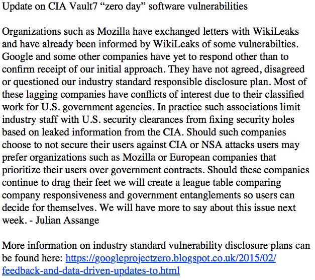 In a statement published on March 17, WikiLeaks stated: “Google and other companies have yet to respond other than to confirm receipt of our initial approach. They have not agreed, disagreed or questioned our industry standard responsible disclosure plan. Most of these lagging companies have conflicts of interest due to their classified work or U.S. government agencies. In practice such associations limit industry staff with U.S. security clearances from fixing security holes based on leaked information from the CIA.”