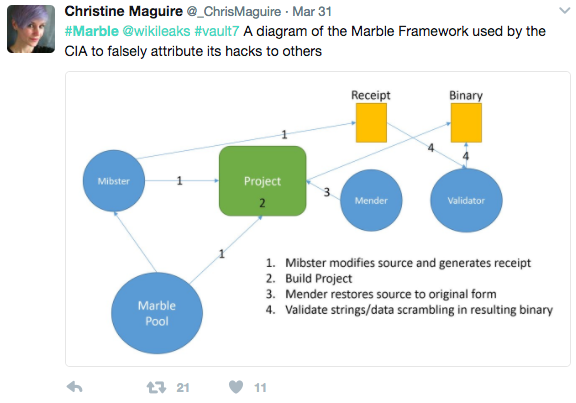 “[Marble] would permit a forensic attribution double game, for example by pretending that the spoken language of the malware creator was not American English, but Chinese, but then showing attempts to conceal the use of Chinese, drawing forensic investigators even more strongly to the wrong conclusion,” a WikiLeaks press release reads.